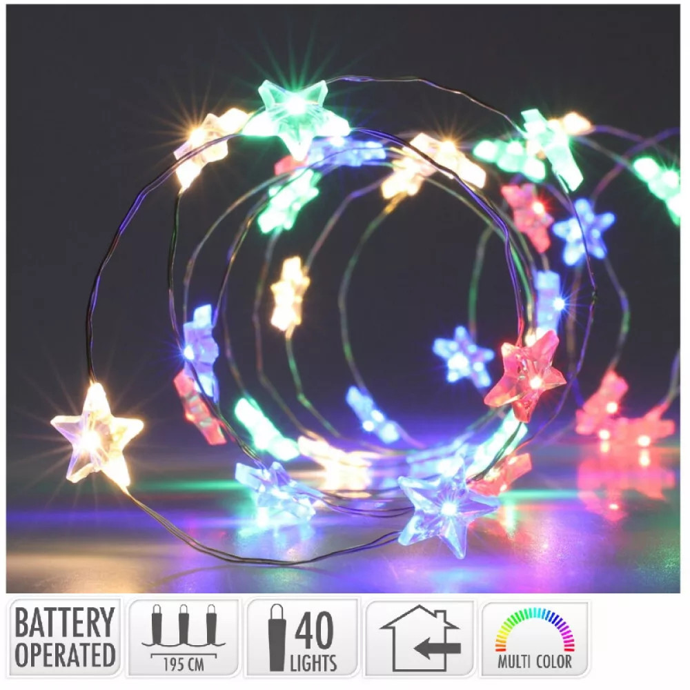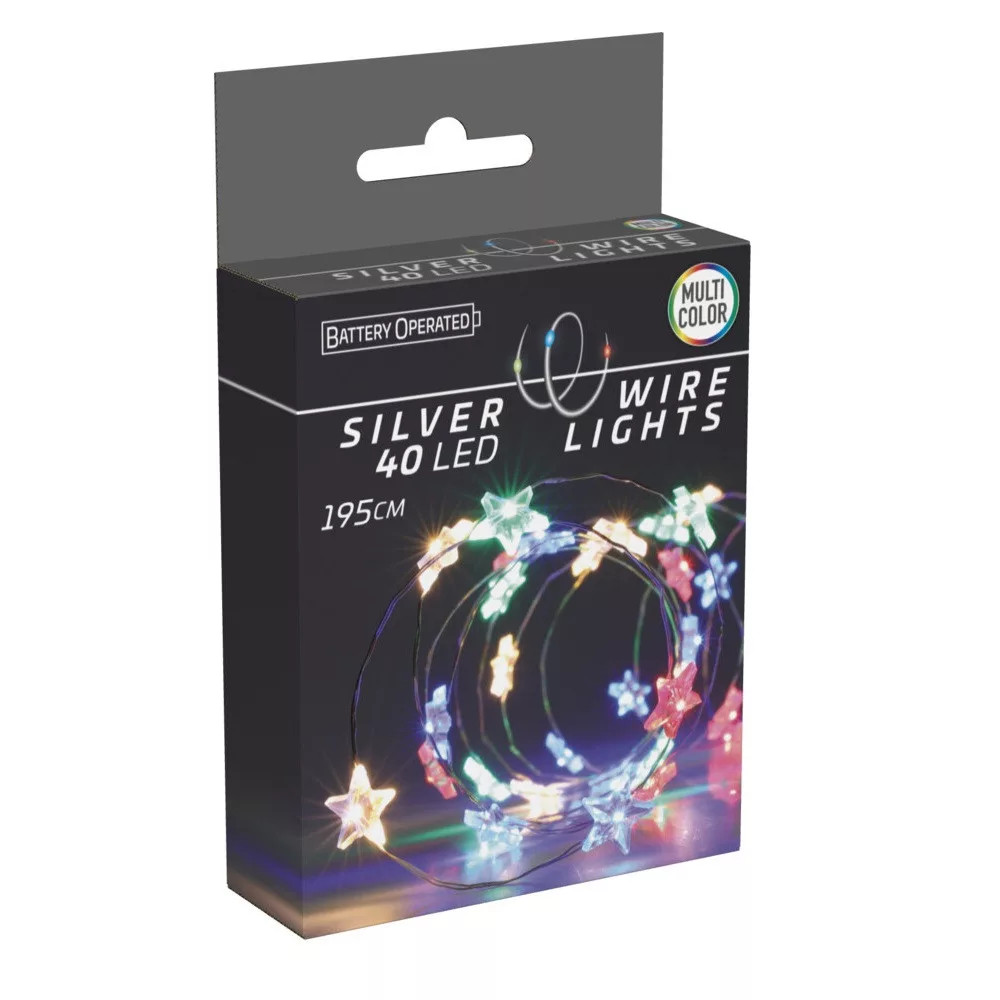 Ezüst drótkábeles csillagfüzér 40 LED-es elemes
