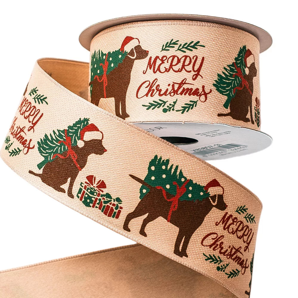 Kutyás karácsonyi szalag "Merry Christmas" felirattal, drótos szegéllyel