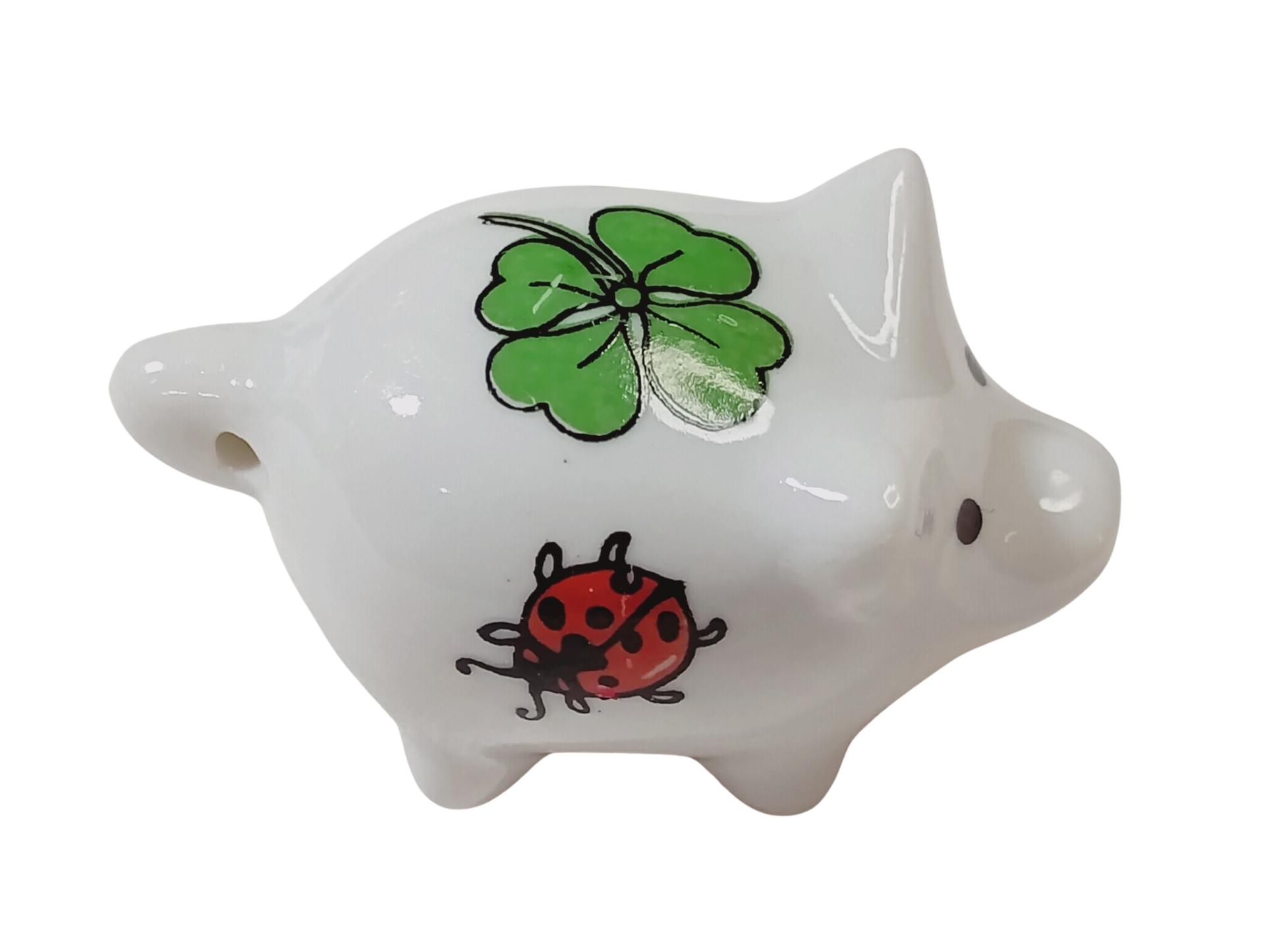 Miniatűr porcelán szerencse malac figura négylevelű lóherével és katicabogárral