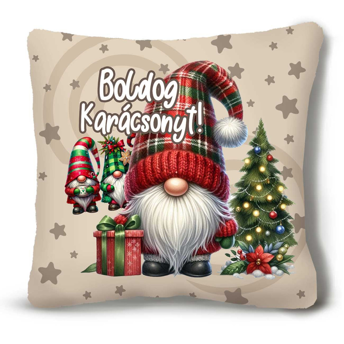 Varázsold ünnepivé az otthonod ezzel a puha karácsonyi plüss párnával, amelyen szeretnivaló gnome manók és egy feldíszített karácsonyfa köszöntik az ünnepet. A "Boldog Karácsonyt!" felirat vidám hangulatot teremt, így tökéletes dekoráció és ajándék is egyben.
