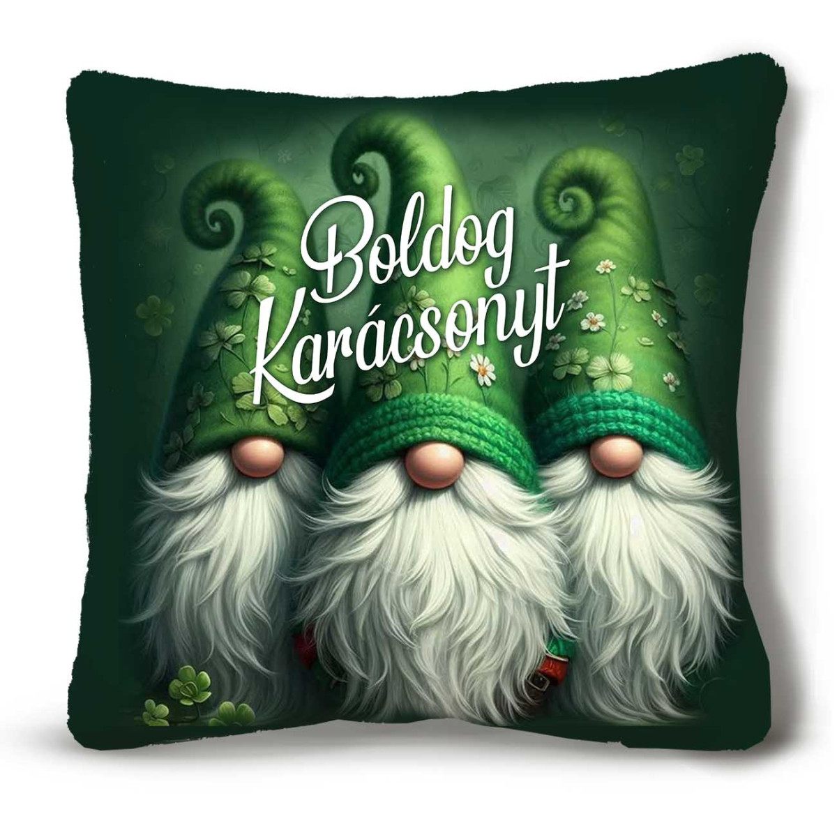 Karácsonyi Plüss Párna – Zöld Gnome Manók "Boldog Karácsonyt" Dekorpárna (45×45 cm)