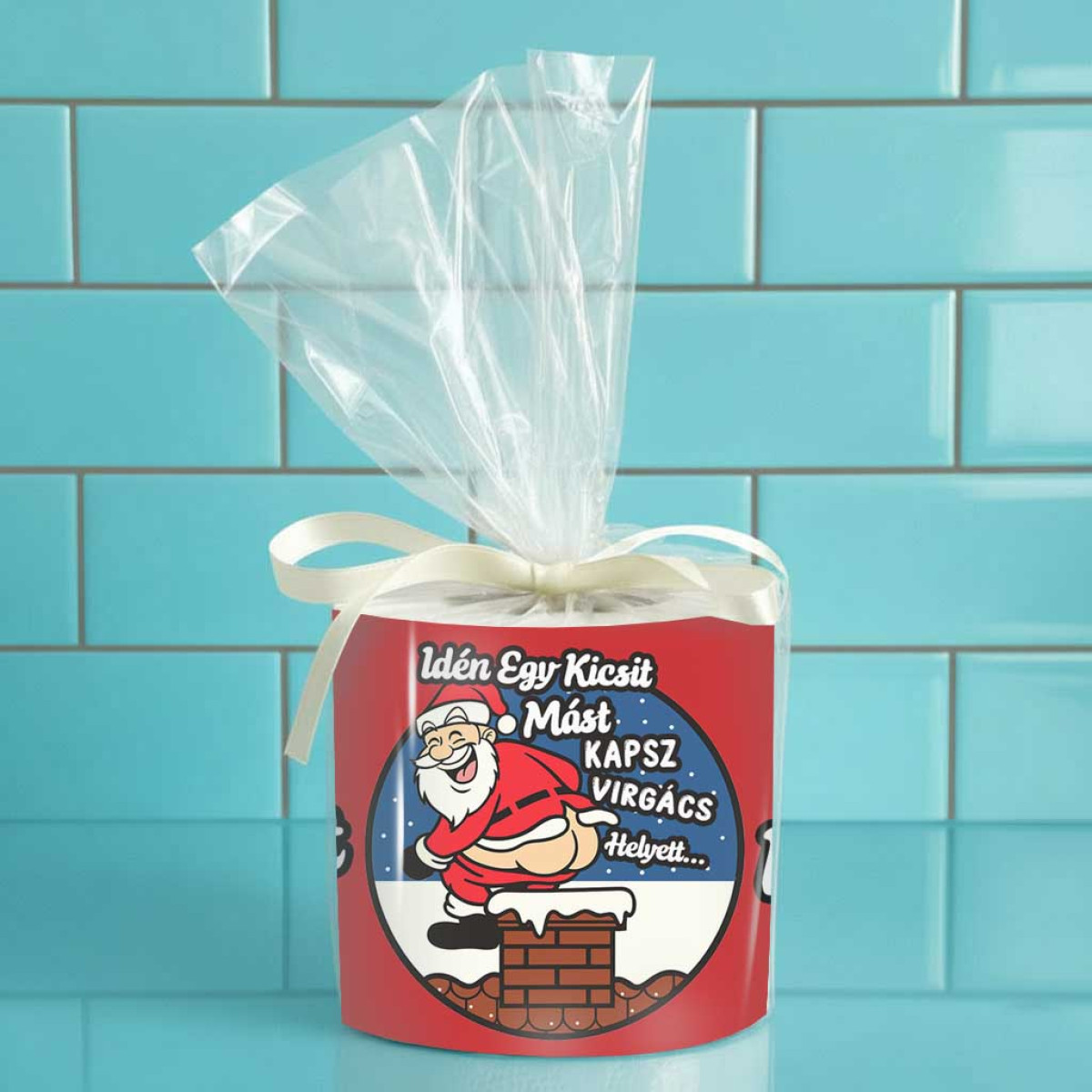 - Különleges tekercs: A tekercs **fehér wc-papír gurigát** tartalmaz, humoros Mikulás dizájnnal csomagolva.
